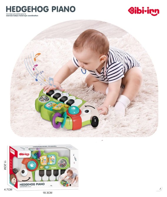 Pianinko o kształcie jeża dla maluszków od osiemnastego miesiąca życia. Zabawka wykonana została z najlepszej jakości materiałów i nie posiada ostrych zakończeń. Żywe kolory przyciągają uwagę dziecka i wzbudzają ciekawość. Pianinko posiada pięć białych klawiszy i cztery czarne. Nad klawiszami umiejscowiono przycisk ze zmianą trybu i włącznikiem melodii. Wyżej znajduje się książeczka do przekładania, bębenek, grzechotka z kolorowymi kuleczkami i gryzak. Zabawka zasilana jest bateriami typu 3 x AAA 1,5V (brak w zestawie).