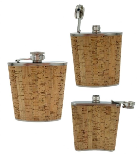 Elegancka solidnie wykonana metalowa piersiówka powleczona korkiem w jasno brązowym kolorze.