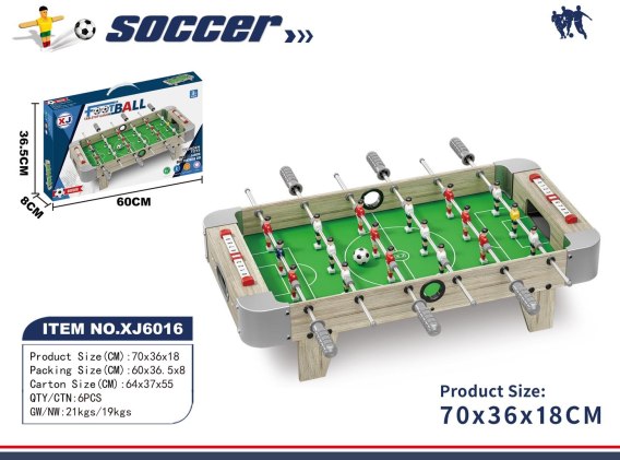 - stół do piłkarzyków ok. 70 cm x 36 cm x 18 cm, - średnica piłki ok.3 cm, - zawodnicy piłkarscy ok. 7,5 cm x 2,5 cm, - opakowanie ok. 60 cm x 8 cm x 37 cm. |