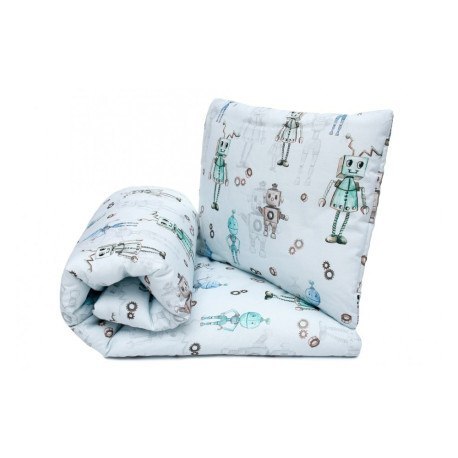 Pościel Bawełniana z wypełnieniem - Roboty Błękitn Z myślą o potrzebach maluchów firma PULP wybiera trwałe i ekologiczne włókno bambusowe oraz włókno produkowane z alg morskich, a także bawełnę ekologiczną. Dzięki wykorzystaniu tych surowców pochodzenia naturalnego tworzą produkty, które spełniają szereg ważnych funkcji zdrowotnych , a przy tym są ładnie i estetycznie wykonane. W PULP najważniejsze jest bezpieczeństwo, wygoda i komfort dziecka. Odzwierciedleniem tej wizji są wysokiej klasy produkty z ekologicznej przędzy bambusowej oraz ekologicznej bawełny. CHARAKTERYSTYKA Komplet pościeli bawełnianej z anty-alergicznym wypełnieniem. Pościel dla dzieci z wypełnieniem wszytym na stałe to fenomenalne rozwiązanie dla rodziców ceniących wygodę użytkowania - można je często prać, w całości wrzucając do pralki. Dzięki temu otrzymujemy gwarancję czystości, która jest niezwykle ważna dla alergików. Pościel wykonana jest z dwóch stron z wysoko-gatunkowej 100% bawełny. Ciepłe I puszyste wypełnienie sprawia,że maluszek czuje się w niej doskonale o każdej porze roku. Miękkie i leciutkie wypełnienie to atestowana, certyfikowana włóknina silikonowa, która przepuszcza powietrze zapewniając właściwy dostęp tlenu, nie uczula, i nie zatrzymuje wilgoci dzięki czemu nasz maluszek ma doskonały komfort snu. Komplet będzie niezapomnianym, stylowym prezentem na Baby Shower, urodziny czy inną okazję. Pościel dziecięca PULP ma piękny, nietuzinkowy design, który doskonale wkomponuje się w nowoczesny wystrój wnętrza modnej mamy. Produkt szyty w Polsce, ręcznie z wykorzystaniem najlepszych jakościowo materiałów. Wszystkie produkty PULP zawierają certyfikat Oeko-Tex Standard 100 (dopuszczone do bezpośredniego kontaktu ze skórą noworodka). Pranie bez obaw o utratę jakości: prać w temperaturze 40°, program delikatny, lekkie wirowanie, można prasować, nie stosować wybielaczy, nie suszyć w suszarce bębnowej. Rozmiar: Uniwersalny rozmiar nadaje się zarówno dla niemowlaka, jak I dla kilku-letniego dziecka. W skład zestawy wchodzi kołderka o wymiarach 80 x 100 cm / +/- 2 cm oraz poduszka 40 x 60 cm / +/- 2cm Skład: 100% najlepsza gatunkowo bawełna Wypełnienie to atestowana, certyfikowana włóknina silikonowa 10315-003