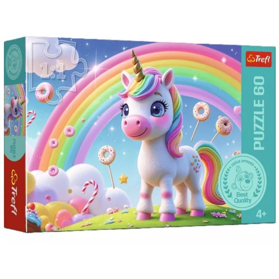Puzzle Trefl Puzzle 60 Cukierkowy świat 17416 przedstawiają kolorowy, słodki świat pełen lizaków, cukierków i słodyczy. Jasne barwy i ciekawe detale sprawiają, że układanie jest przyjemne i rozwijające dla najmłodszych.