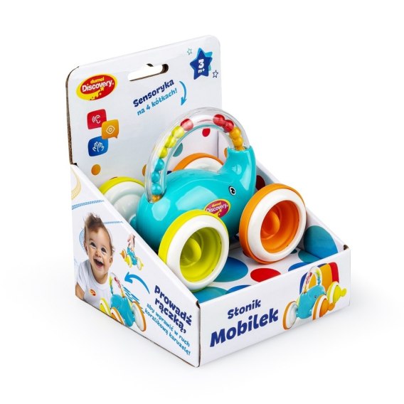 Wirując koralikami nadciąga Mobilek! Ten kolorowy słonik na czterech kółkach posiada przezroczystą trąbę, wygiętą w praktyczny uchwyt. Wewnątrz niej znajdują się koraliki, które przy prowadzeniu zwierzaka rączką, przesypują się wesoło, krążąc od słoniowej trąby, do wnętrza słonika. Koła zwierzaczka okalają miękkie obręcze, a ich środek zdobią elementy do wciskania i wyciągania, wprost idealne do ćwiczenia sprawności małych paluszków.