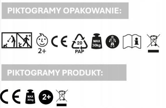 OSTRZEŻENIA! Produkt nieprzeznaczony dla dzieci poniżej 2 roku życia. Maksymalna waga obciążenia 30 kg. Konieczność stosowania środków ochronnych (kasku, ochraniaczy na kolana i łokcie, odpowiednich butów). Stosować pod kontrolą dorosłych. Nie do użytku w ruchu ulicznym. By zapobiec upadkowi lub wyrządzeniu krzywdy osobom trzecim, należy dziecku wytłumaczyć zasady bezpieczeństwa oraz ostrożności. Zabawka musi być przechowywana w miejscu niedostępnym dla dzieci poniżej wieku określonego przez producenta.