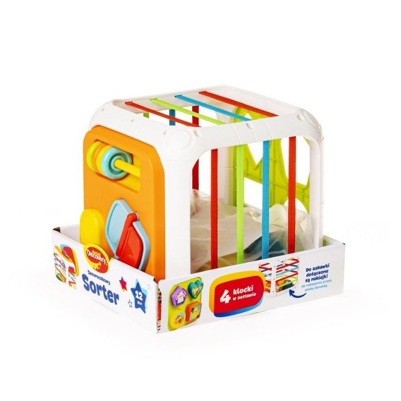 Ta kolorowa kostka to zaproszenie do wesołej zabawy! Zdobią ją sznureczki i sorter kształtów, a jedna z jej ścianek jest odpinana, co zapewnia wygodny dostęp do klocków. Poza tym, że ścianka ta jest odpinana, jest ona również dwustronna. Z jednej strony znajdują się trybiki do kręcenia, a z drugiej, ruchome elementy do przesuwania. Możliwość odpięcia ścianki pozwala zabrać ją ze sobą na wycieczkę, bez konieczności przewożenia całej kostki.