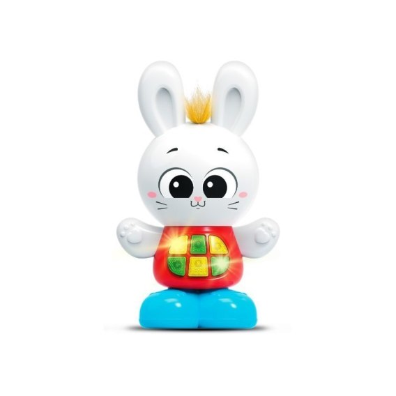 Wesoły, rozgadany króliczek wie jak zainteresować najmłodszych! Zna aż 25 różnych dźwięków i melodii, w tym nawet edukacyjną piosenkę. Poszczególne funkcje aktywują świecące przyciski, znajdujące się na króliczym brzuchu. Głowę zwierzaka zdobi żółta czuprynka z sensorem dotyku. Gdy dotkniemy jej, aktywujemy zabawne dźwięki. Króliczek posiada sprężyste nóżki, co umożliwia przyciśnięcie go, której to czynności towarzyszy odgłos sprężynowych podskoków.