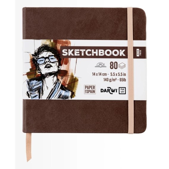 Szkicownik w twardej oprawie z zaokrąglonymi rogami, zamykany na gumkę. Otwiera się na płasko (180°).
