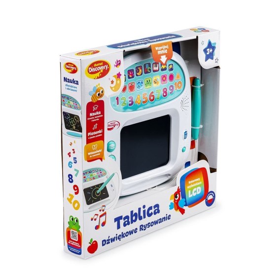 Ta edukacyjna tablica bawi, edukuje, a nawet inspiruje artystycznie! Zabawkę tworzy panel dźwiękowy, wyposażony w kolorowe przyciski z obrazkami, oraz tablica do rysowania. Kolorowe obrazki uczą liczenia, kolorów, kształtów, a także bawią grą w zgadywanie. Znajdziemy tu także wesołe melodie i zabawne dźwięki. Obok tablicy, stanowiącej przestrzeń do artystycznych improwizacji dziecka, znajdują się trzy dodatkowe przyciski, które aktywują wskazówki do rysowania oraz piosenki w języku polskim. Tablica wyposażona została w niezwykle przydatną funkcję blokady zmazywania, co pozwala zapobiec przypadkowemu usunięciu obrazka, narysowanego za pomocą dołączonego rysika.