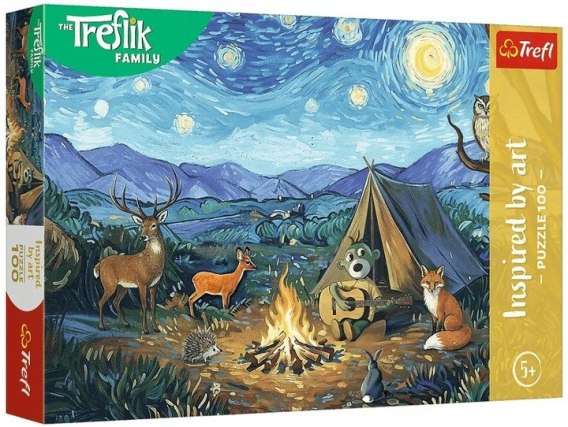 Puzzle 100 el. Inspired by Art Przy ognisku ukazują treflikowych bohaterów w ciepłej, artystycznej scenerii wieczornego ogniska. Po ułożeniu tworzą obrazek o wymiarach 410 × 275 mm.