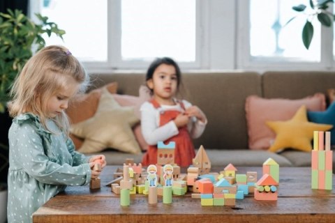 Drewniane klocki wspierają rozwój kreatywności, a figurki zachęcają do odgrywania ról i wspierają rozwój wyobraźni