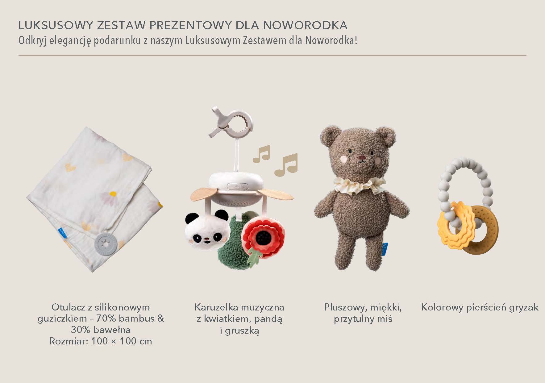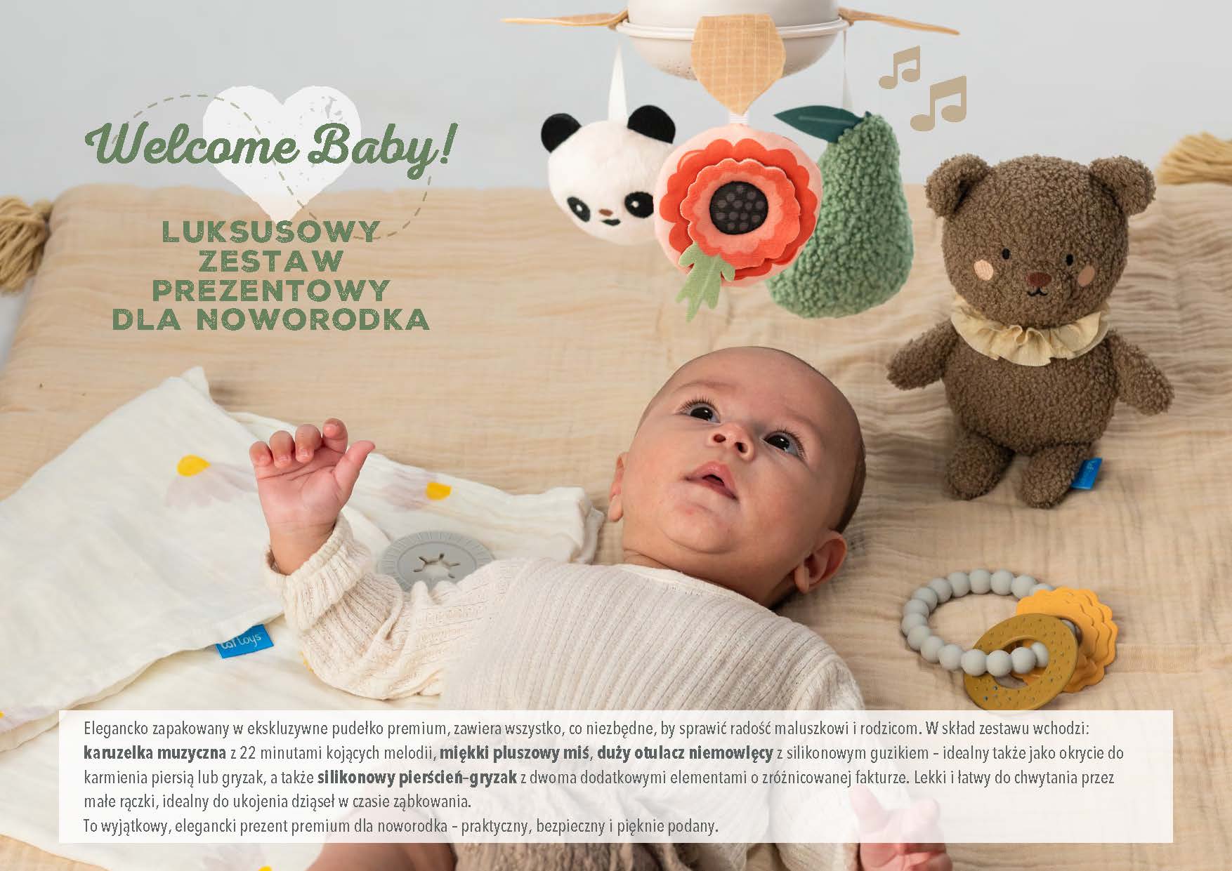 Taf Toys Ekskluzywny Zestaw Prezentowy dla Noworodka 🎁 to elegancki i praktyczny wybór dla maluszka już od urodzenia. W zestawie: karuzela z kojącą muzyką 🎶, przytulny miś do tulenia 🐻, miękki bambusowy otulacz XL oraz silikonowy gryzak z teksturą. Wszystko, czego potrzeba na start - w jednym pięknym pudełku! To prezent, który zachwyci wyglądem, ale przede wszystkim jakością i funkcjonalnością. Idealny na baby shower, powitanie dziecka czy wyjątkową wyprawkę. Bezpieczny, trwały i stworzony z myślą o potrzebach najmłodszych 👶.
