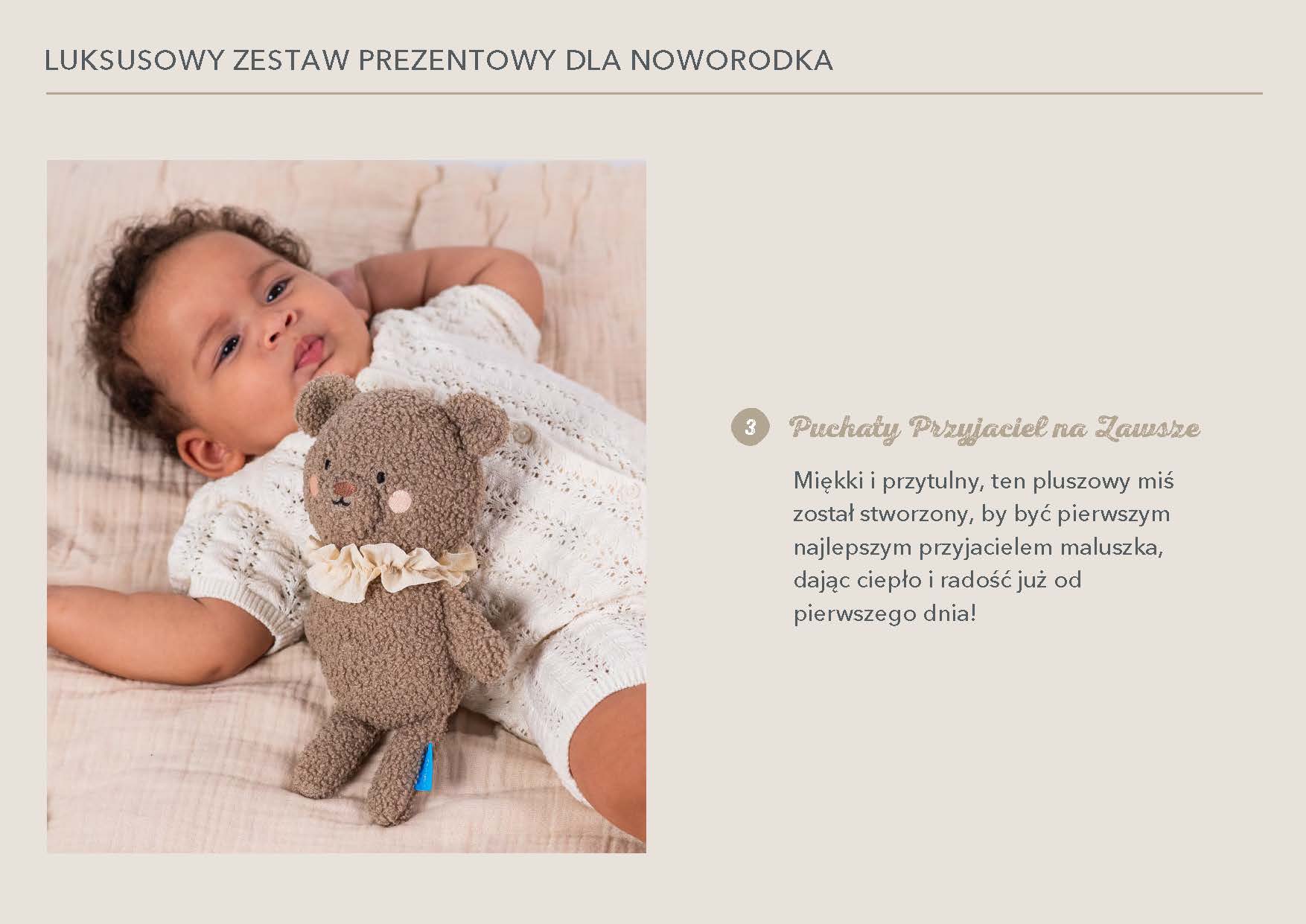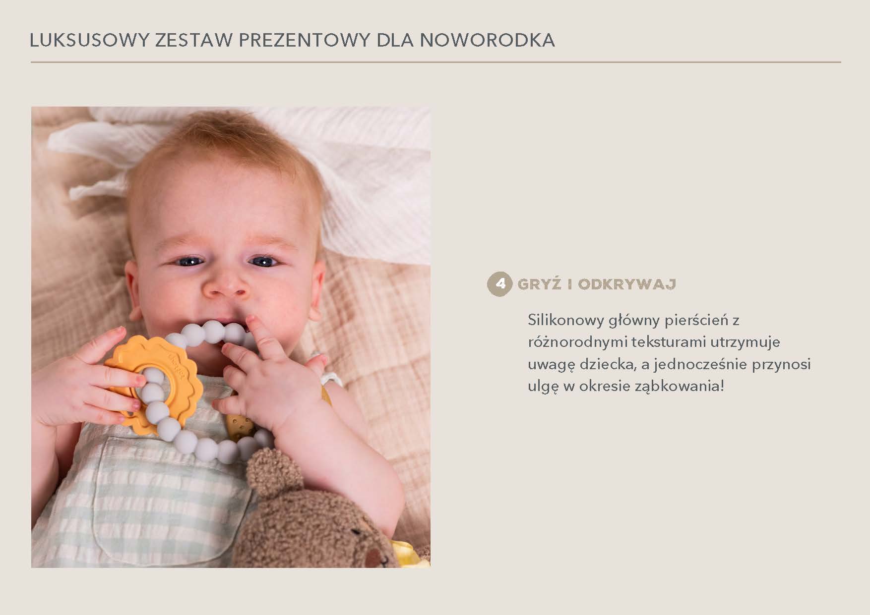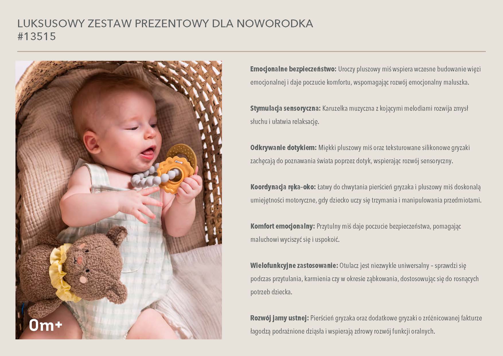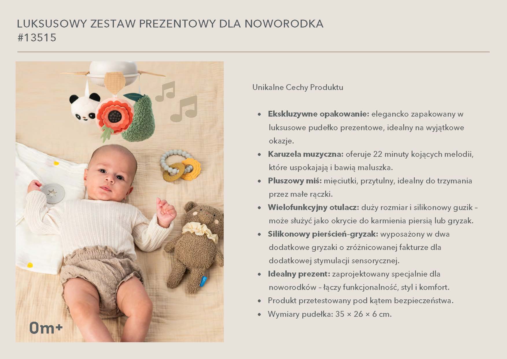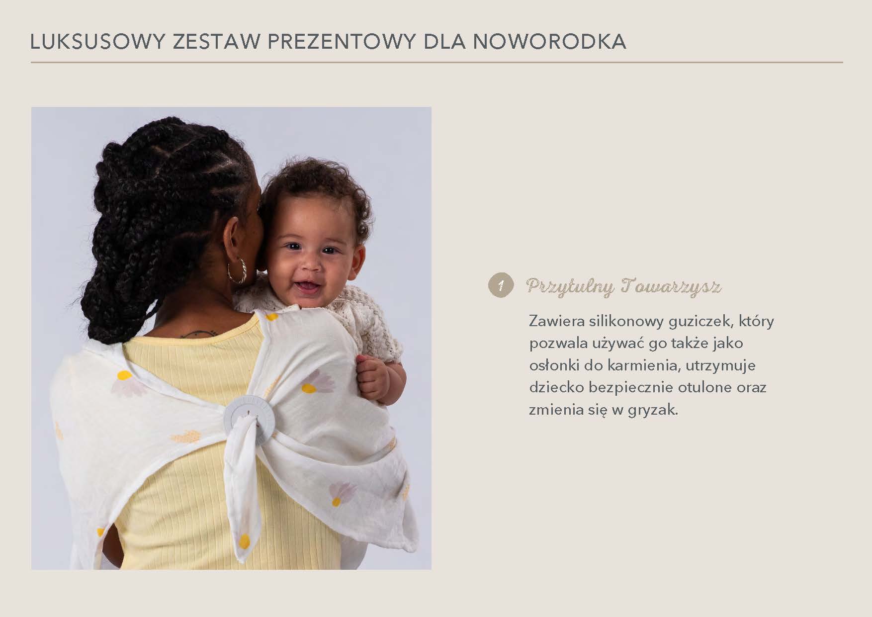 Zestaw wspiera rozwój emocjonalny, zmysłowy i motoryczny już od pierwszych dni życia. Każdy element jest przemyślany, bezpieczny i zaprojektowany z myślą o małych rączkach i wrażliwej skórze niemowlęcia. To doskonały wybór na baby shower, wyprawkę lub prezent „na powitanie".