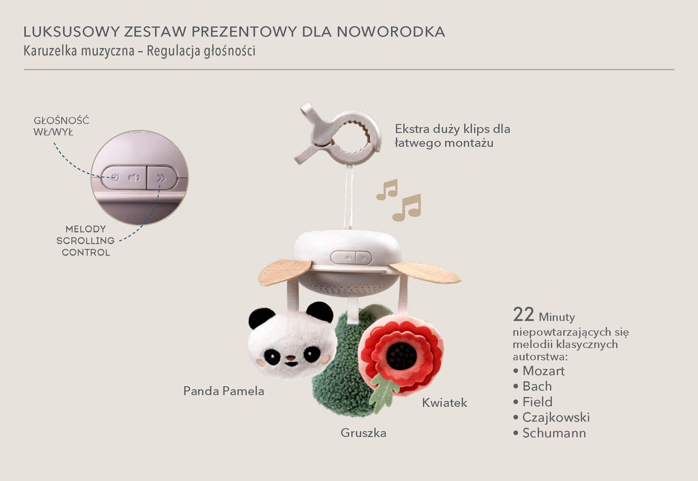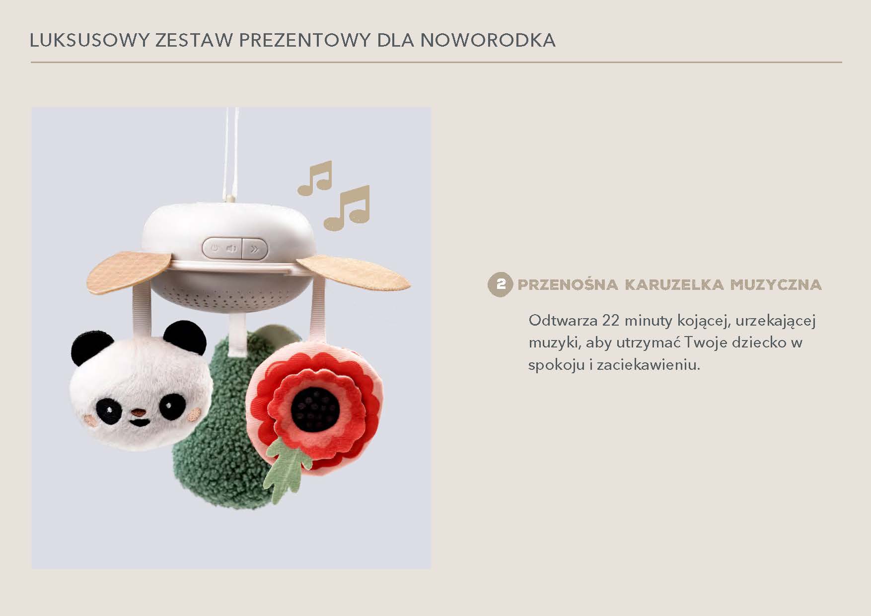 Szukasz prezentu, który zachwyci nie tylko wyglądem, ale też troską o potrzeby noworodka? 🎁 Taf Toys Luxury Newborn Kit to wyjątkowy zestaw zapakowany w eleganckie, luksusowe pudełko, który łączy estetykę z funkcjonalnością. Znajdziesz w nim cztery starannie dobrane produkty: muzyczną karuzelę (22 minuty ukojących melodii), mięciutkiego misia przytulankę 🐻, duży bambusowy otulacz XL z silikonowym guzikiem oraz silikonowy gryzak z dodatkowymi wypustkami do gryzienia.
