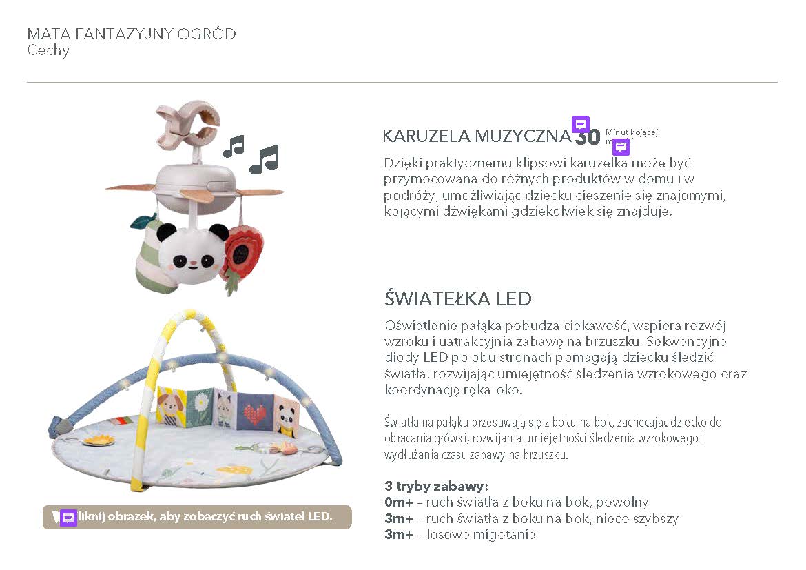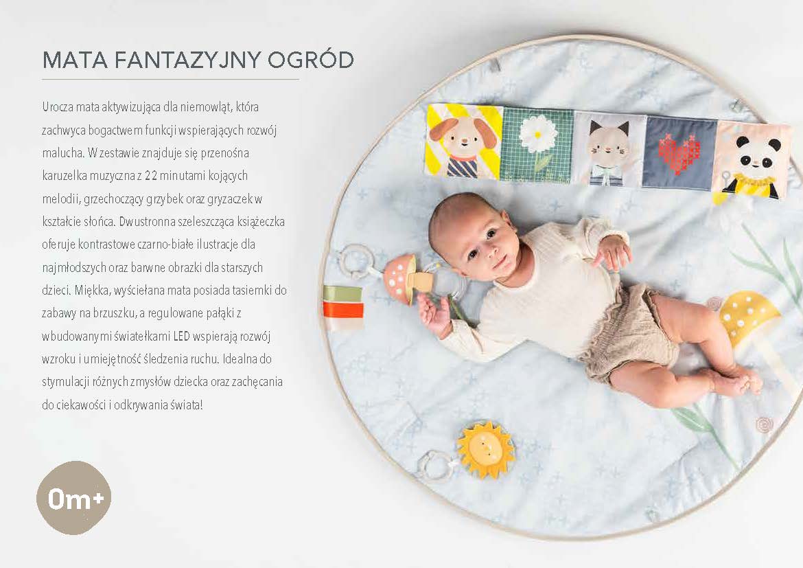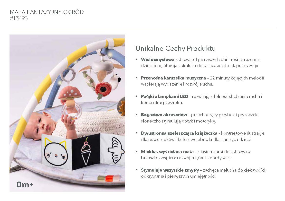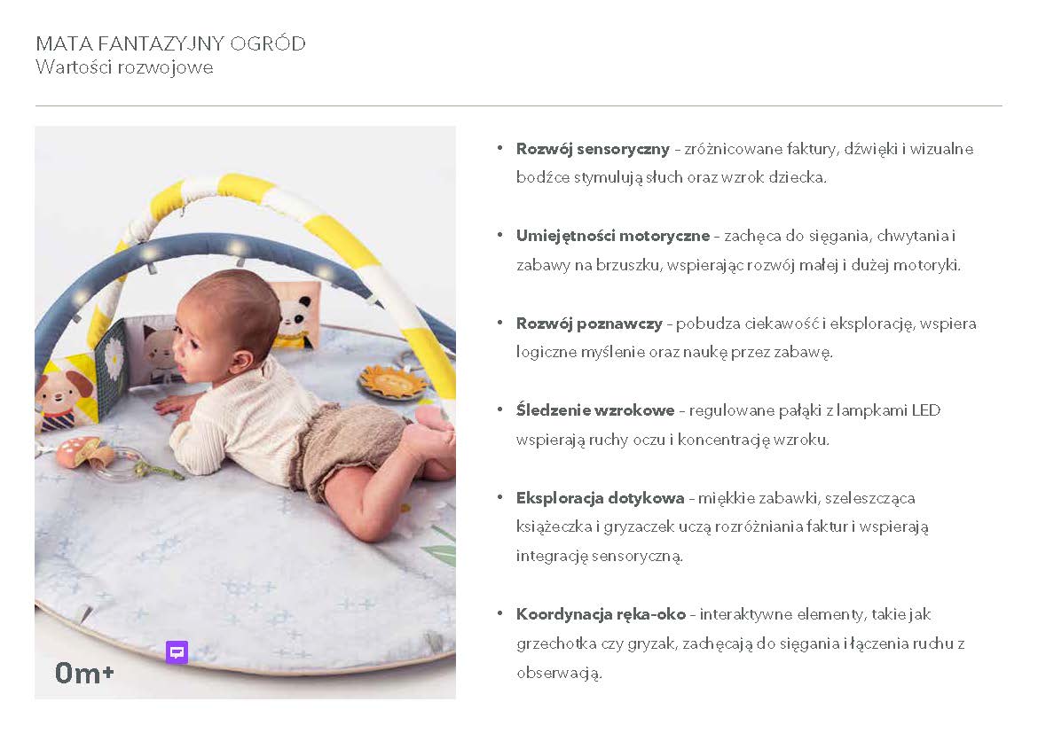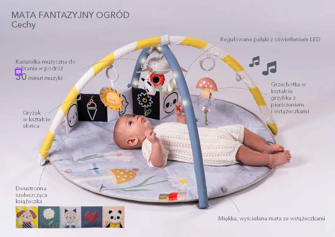 Taf Toys Mata Edukacyjna z Melodią i Światełkami - Melody Bloom Gym 🎶 to wyjątkowa przestrzeń do zabawy i rozwoju już od pierwszych dni życia 👶. Miękka, kolorowa mata z regulowanymi łukami LED przyciąga uwagę dziecka i wspiera rozwój wzroku oraz koncentracji. Karuzela z 22 minutami melodii uspokaja maluszka, a grzechotka grzybek, gryzak słoneczko i szeleszcząca książeczka zachęcają do chwytania, dotykania i odkrywania ✨. Zabawa na brzuszku z kolorowymi wstążkami wzmacnia mięśnie i wspiera motorykę, a mata „rośnie" razem z dzieckiem, dostarczając bodźców na każdym etapie rozwoju. Idealna do codziennego odkrywania świata - przez zabawę, dźwięk, ruch i zmysły!