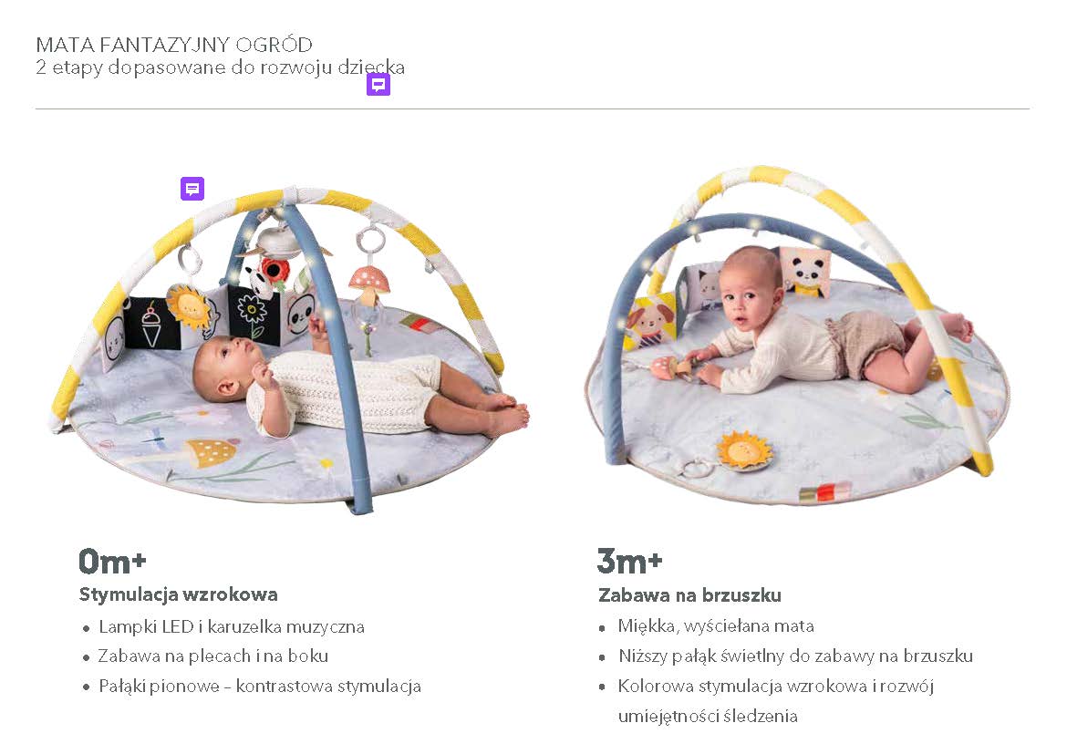 Taf Toys tworzy zabawki, które są nie tylko piękne i trwałe, ale przede wszystkim wspierają naturalny rozwój dziecka - od noworodka do aktywnego niemowlaka. Melody Bloom Gym to przemyślana przestrzeń do nauki przez zabawę, stymulująca wszystkie zmysły i wspierająca zdrowy rozwój od pierwszych chwil życia.