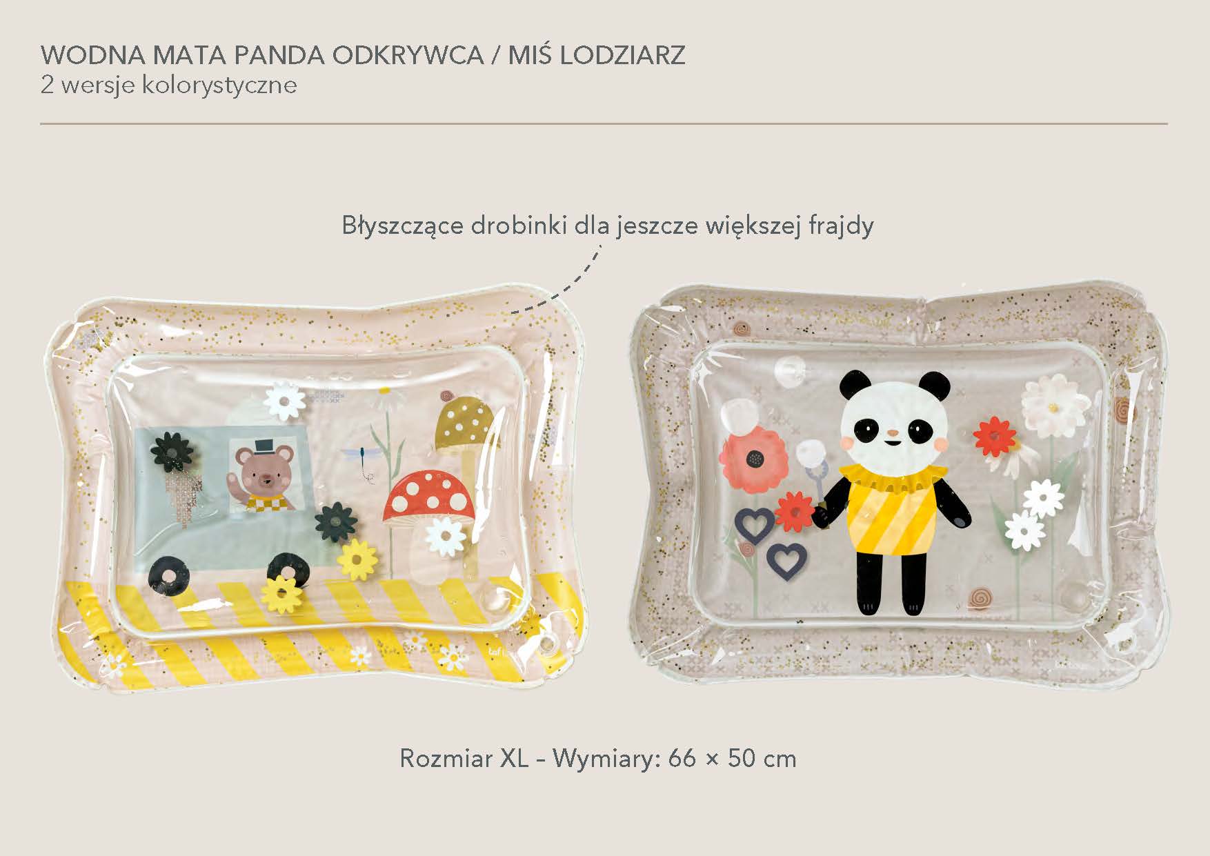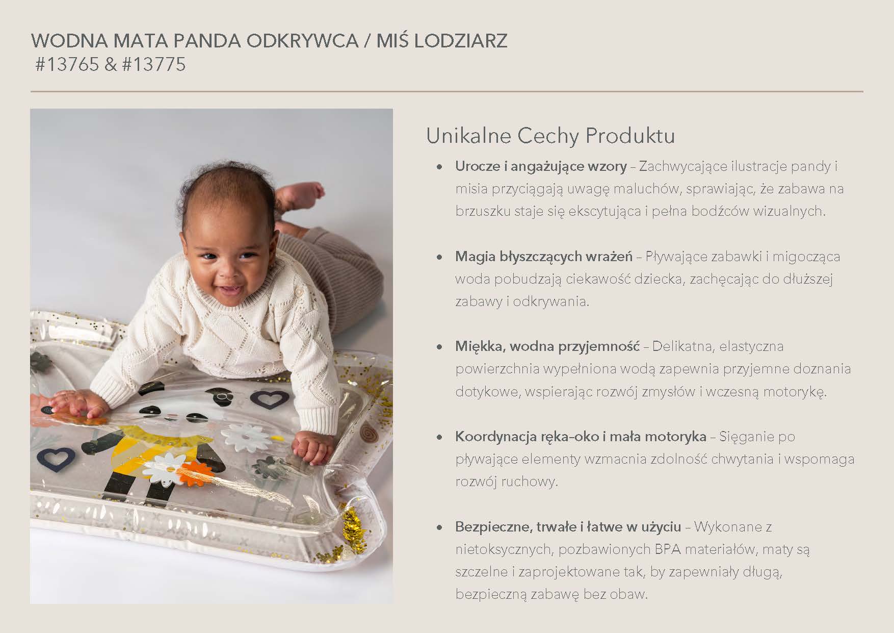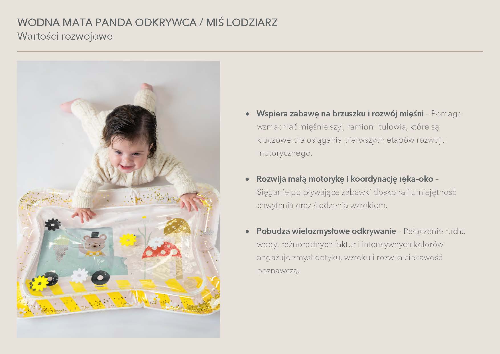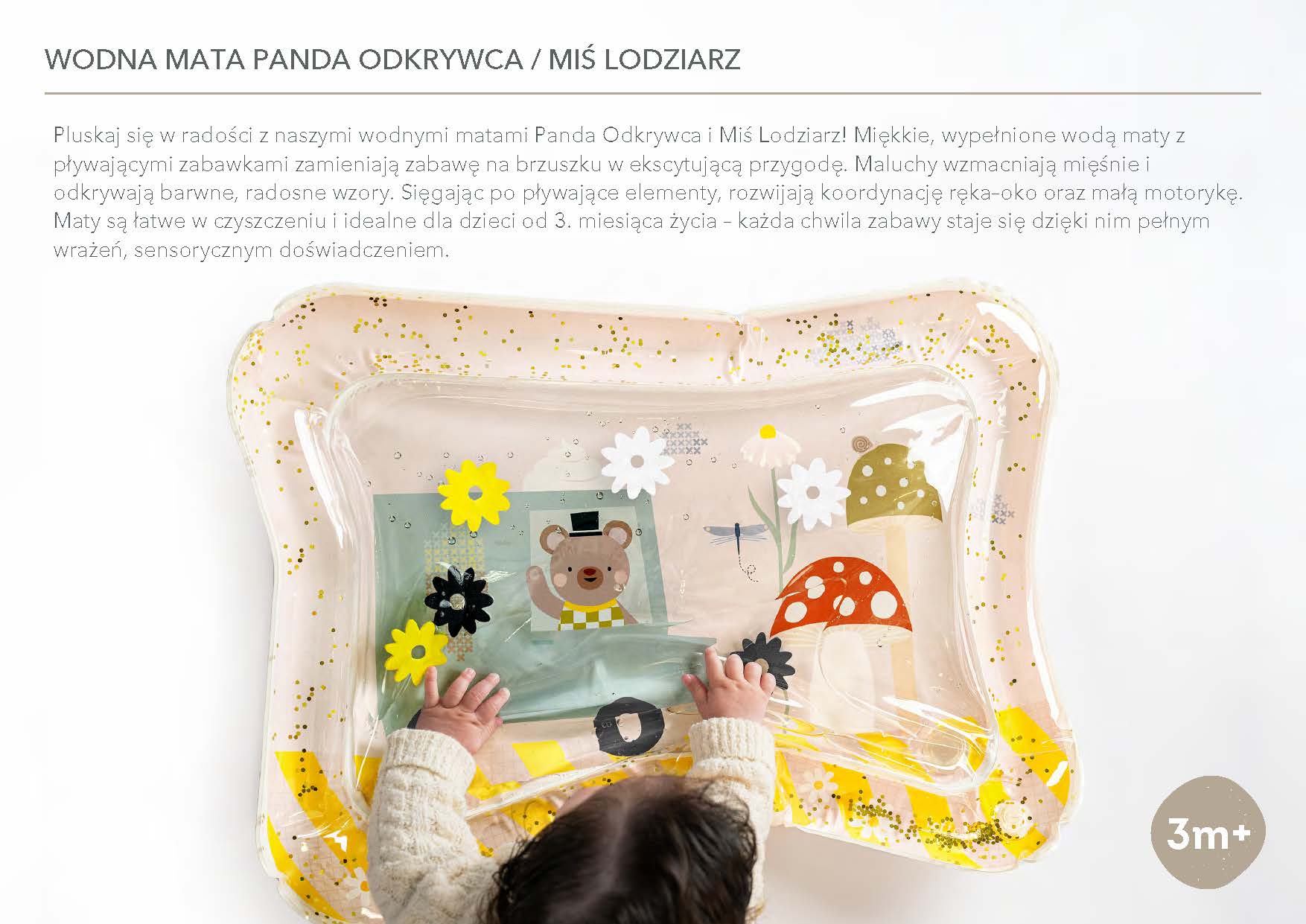 Zamień czas na brzuszku w prawdziwą wodną przygodę z Taf Toys Wodną Matą - Panda Odkrywca! 🐼💧 Ta sensoryczna mata z pływającymi zabawkami i brokatem zachęca dziecko do ruchu, wzmacnia mięśnie i rozwija koordynację 👶🖐️. Dzięki miękkiej strukturze i bezpiecznym materiałom, maluch czuje się komfortowo i chętnie wraca do zabawy. Ilustracje z pandą przyciągają wzrok, a błyszczące drobinki intrygują i motywują do eksploracji ✨. Doskonała do nauki leżenia na brzuszku i wspierania rozwoju już od 3. miesiąca życia. Łatwa do napełnienia i zabrania w podróż! 🚗