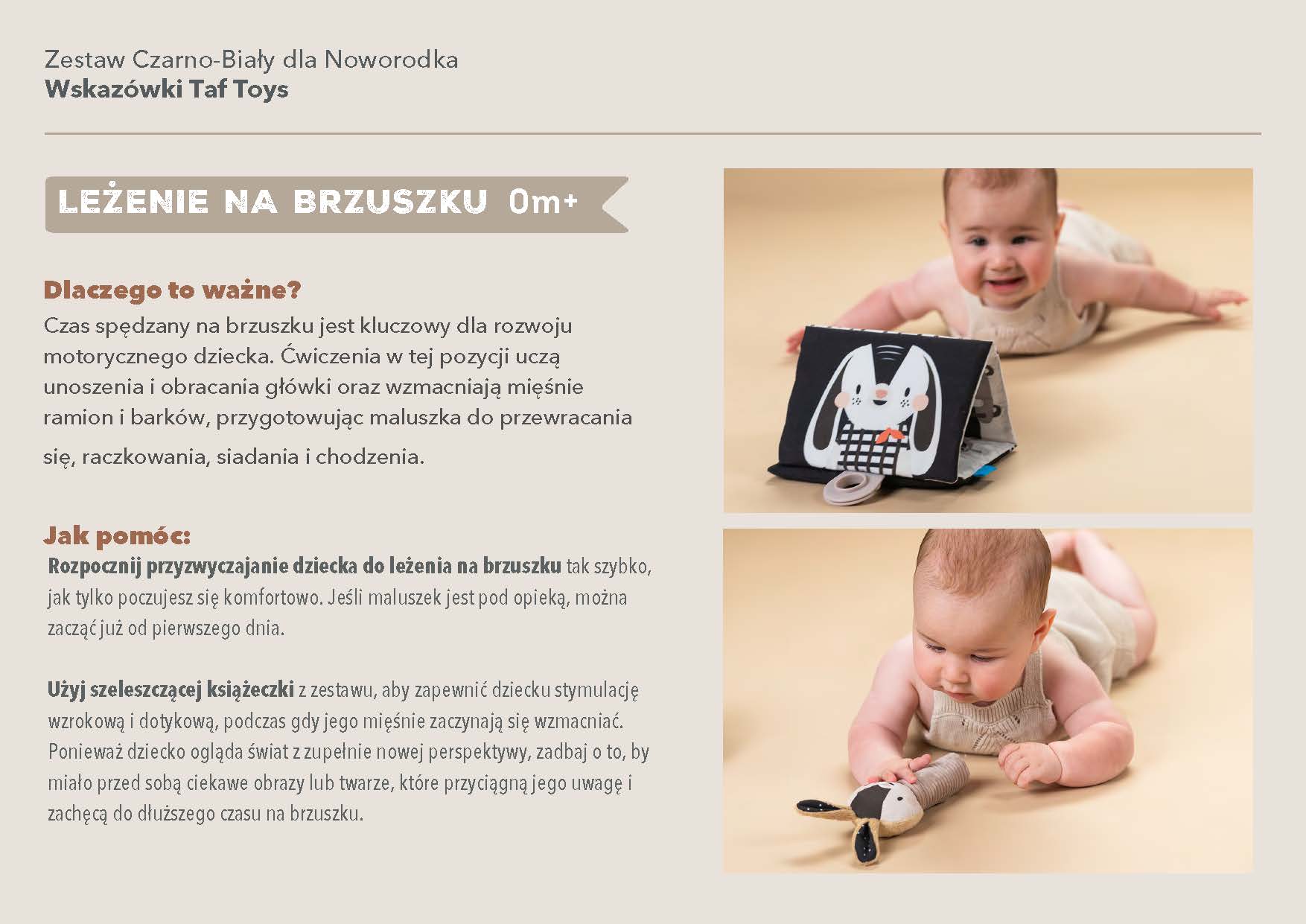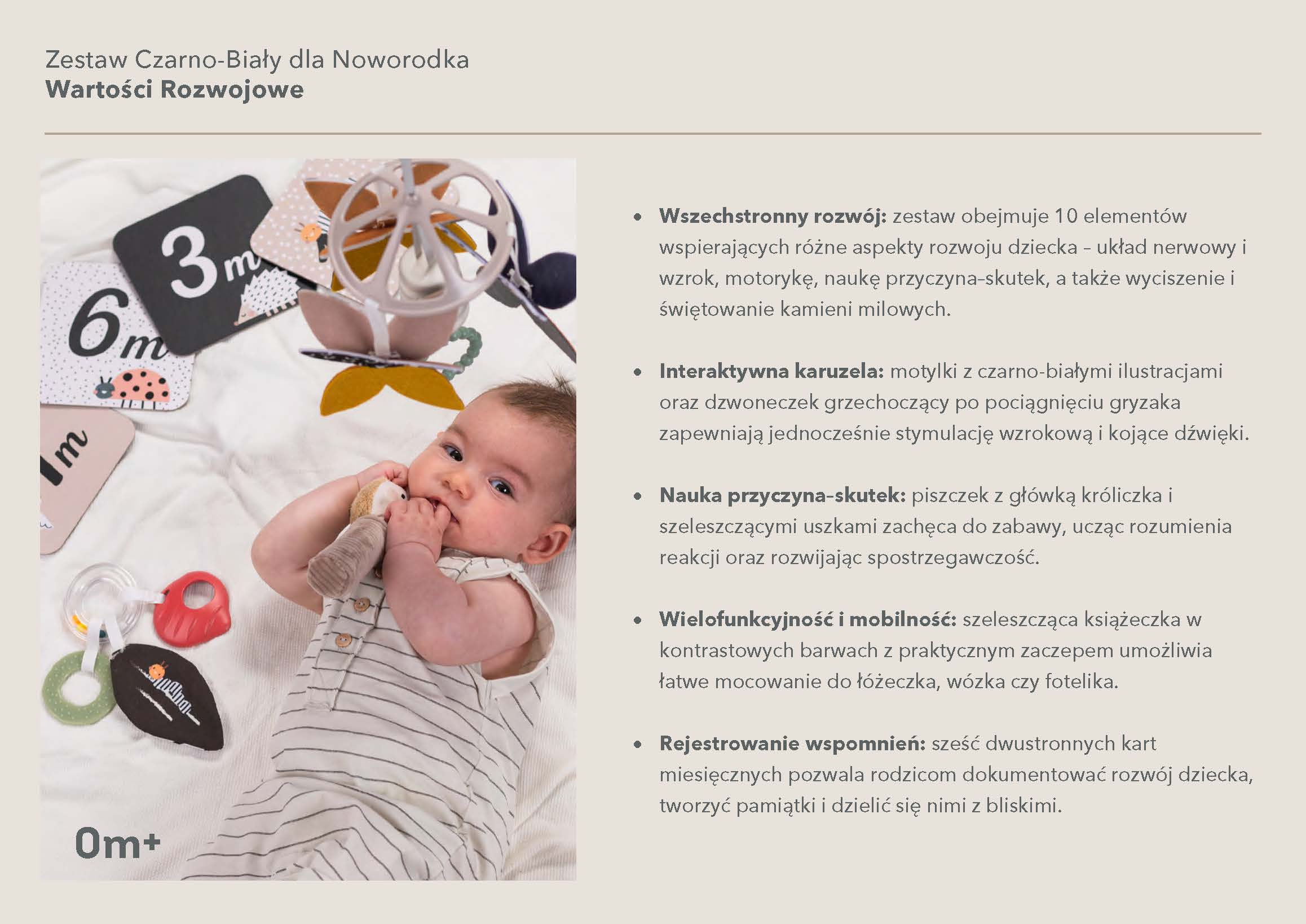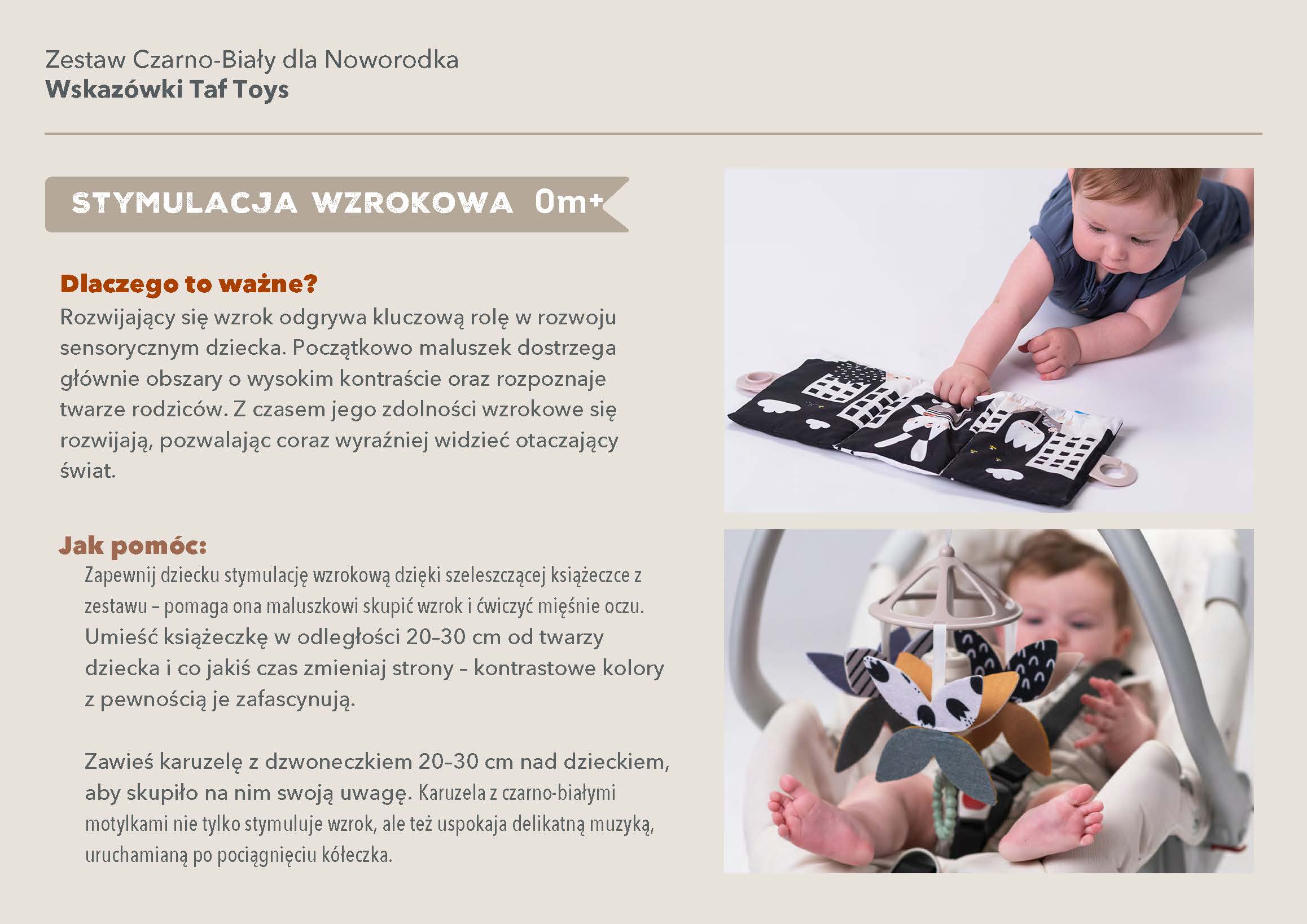 Zestaw Black & White został zaprojektowany specjalnie z myślą o pierwszych tygodniach i miesiącach życia dziecka - to czas, kiedy odpowiednia stymulacja wspiera rozwój układu nerwowego, wzroku i zdolności poznawczych. Produkty Taf Toys łączą funkcjonalność z estetyką i bezpieczeństwem - rosną razem z dzieckiem i sprawiają radość zarówno maluszkom, jak i rodzicom.