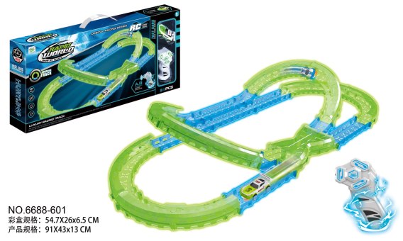 Duży tor wyścigowy świecący w ciemności to propozycja dla dzieci od szóstego roku życia. Zestaw składa się z pilota, samochodziku i części konstrukcyjnych toru. Pilot zasilany jest bateriami typu 2 x AAA (brak w zestawie), samochód akumulatorem typu 3,7V i ładowany kablem USB (zawarte w zestawie). Tor jest fluorescencyjny, świeci w ciemności. Samochodzik posiada podświetlenie LED, jeżdżąc, tworzy niesamowite efekty. Zabawa torem pozytywnie wpływa na koordynację wzrokowo-ruchową, budowanie toru pobudza wyobraźnię dziecka oraz rozwija zdolności manualne.