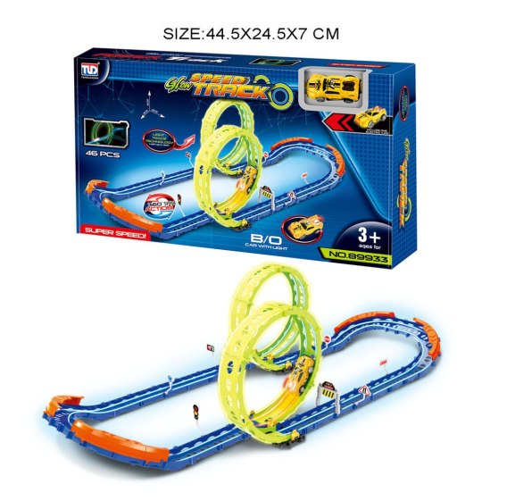 Fluorescencyjny tor wyścigowy z ostrymi zakrętami, pętlami i szybkim autkiem to propozycja dla dzieci od trzeciego roku życia. Zestaw składa się z 46 elementów do samodzielnego montażu. Na torze znajdują się odcinki proste, ostre zakręty z barierkami zabezpieczającymi przed wypadaniem pojazdu z trasy, a także dwie pętle 360 stopni. Pętle są fluorescencyjne, świecą w ciemności. Autko również posiada oświetlenie w tylnej części. Autko zasilane jest bateriami typu 2 x AAA 1,5 V, baterii brak w zestawie.