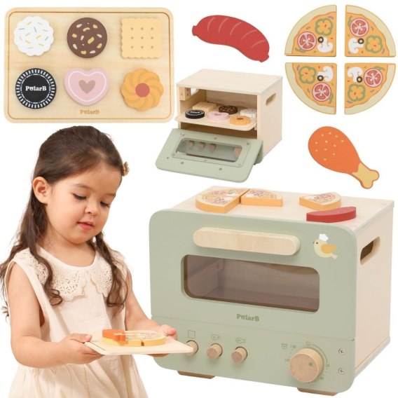Zestawowi do Pieczenia Słodko-Pikantnych Potraw od VIGA! Ten innowacyjny zestaw, stylizowany na nowoczesny toster/piekarnik w modnym, zielonym odcieniu, idealnie nadaje się do odgrywania ról w kuchni. W zestawie znajduje się 12 realistycznych, drewnianych akcesoriów spożywczych, w tym pyszne ciasteczka, mini pizza (krojona na 4 części), kiełbaska oraz udko kurczaka. Piekarnik ma otwieraną klapę, ruchome pokrętła i wysuwaną tacę, co sprawia, że zabawa jest niezwykle autentyczna. Zabawa w pieczenie i gotowanie nie tylko zapewnia świetną rozrywkę, ale także intensywnie rozwija małą motorykę, koordynację wzrokowo-ruchową, a także kreatywność i świadomość społeczną. Dzięki temu zestawowi, maluchy mogą naśladować dorosłych, uczyć się serwowania i dzielenia posiłków. To idealny dodatek do każdej drewnianej kuchni, gwarantujący godziny bezpiecznej i rozwijającej zabawy!