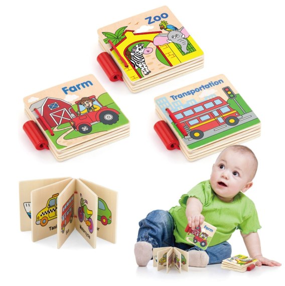 Moja pierwsza książeczka drewniana od marki VIGA to wyjątkowa zabawka edukacyjna, która wprowadza najmłodszych w świat literatury w niezwykle trwały i bezpieczny sposób. Każda karta książeczki została wykonana z naturalnego drewna i połączona ozdobnym, czerwonym sznureczkiem, co ułatwia małym rączkom wygodne przewracanie stron. Na poszczególnych elementach znajdują się kolorowe, przyciągające wzrok ilustracje opatrzone podpisami w języku angielskim, dzięki czemu dziecko od najmłodszych lat oswaja się z językiem obcym. Zabawka występuje w trzech wersjach tematycznych: Zoo, Farma oraz Transport, co pozwala na poznawanie zwierząt, kolorów oraz różnych pojazdów.