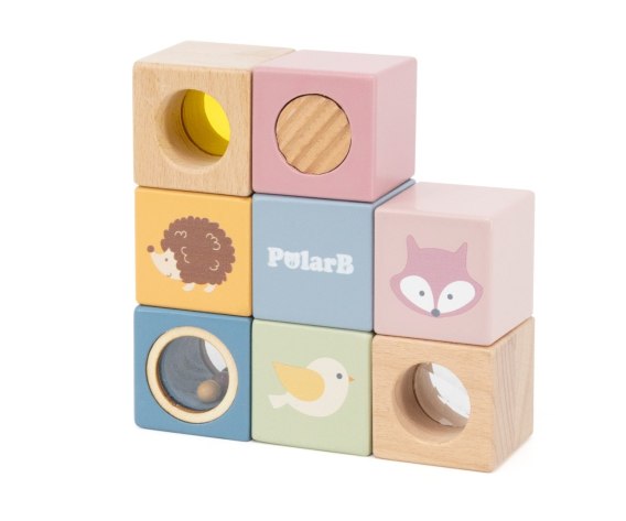 Zestaw składa się z 8 klocków o wymiarach 4 × 4 × 4 cm, wykonanych z drewna i pomalowanych nietoksycznymi, pastelowymi farbami charakterystycznymi dla linii PolarB. Klocki można dowolnie układać, budować wieże lub używać ich jako pomocy sensorycznej w zabawie.