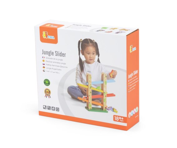 Zestaw zjeżdżalnia dżungla to duża zabawka w kształcie 4-poziomowej platformy, z której można spuszczać klocki w kształcie zwierząt. Każdy z 6 klocków ma zamocowane po bokach małe trzpienie, które umożliwiają zjazd po torze ruchem obrotowym. Klocki można wykorzystać również jako małe bączki. Tor ma prosty, ale zachęcający do zabawy design. Jego kolorystyka jest przyjazna dla dzieci i przyciąga ich uwagę.