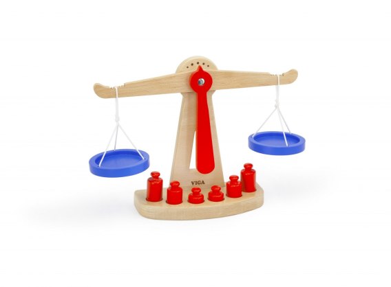 Zestaw zawiera wagę wraz z odważnikami. Idealna podczas zabawy w sklep, dziecko nauczy się odważać towar.