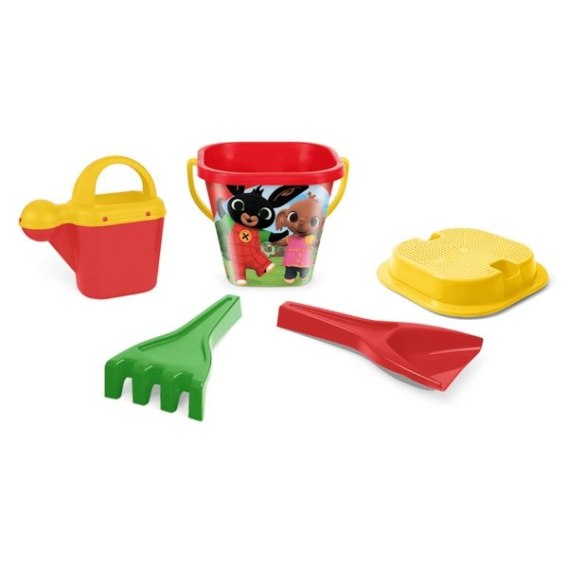 Komplet letni z wizerunkami postaci z bajki Bing składa się z 5 elementów: wiaderka o pojemności 2 litrów z grafiką IML, łopatki, grabek, sitka i konewki