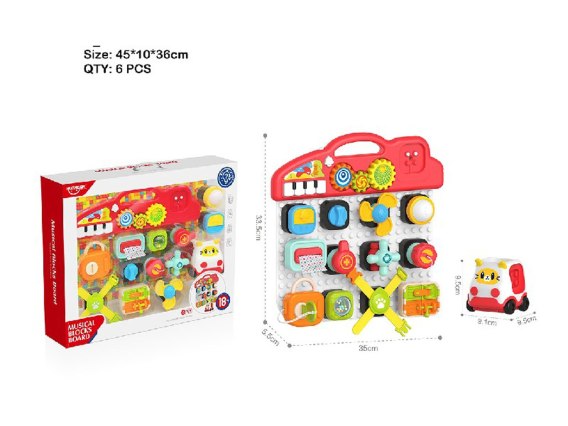 - tablica ok. 35 cm x 2 cm x 33,5 cm, - samochodzik ok. 9,5 cmx 9,1 cm x 9,5 cm, - klocuszek z kluczem i kłódką ok. 8 cm x 9,5 cm x 5 cm, - klocuszek z pompką ok. 5,5 cm x 6,5 cm x 5 cm, - klocuszek z żarówką ok. 5,5 cm x 5 cm x 5 cm, - klocuszek z dzwonkiem ok. 5,5 cm x 5,5 cm x 4,5 cm, - klocuszek ze spinerkiem ok. 8 cm x 8 cm x 5 cm, - klocuszek z zamkami ok. 8 cm x 6 cm x 5 cm, - klocuszek z gwintem ok. 6,5 cm x 5 cm x 5 cm, - klocuszek z kurkiem ok. 5,5 cm x 6 cm x 5,5 cm, - klocuszek z elementem do wyciągania ok. 7,5 cm x 7 cm x 5,5 cm, - klocuszek z pokrętłem ok. 5 cm x 5 cm x 4 cm, - klocuszek z kuleczkami do grzechotania ok. 5 cm x 5 cm x 5 cm, - klocuszek z paskami ok. 17 cm x 15,5 cm x 3 cm, - opakowanie ok. 44,8 cm x 36 cm x 10 cm. |