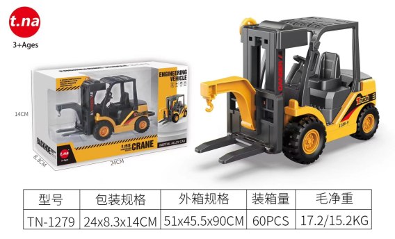 Wózek widłowy z napędem frykcyjnym, gumowymi oponami oraz ruchomymi elementami to propozycja dla dzieci od trzeciego roku życia. Wózek sterowany jest manualnie, za pomocą korbki możemy podnosić i opuszczać ładunek. Widły wózka można składać. W zestawie znajduje się również paleta. Na tylnych kołach wózka umiejscowiono napęd, możemy przesuwać pojazd do przodu i tyłu. Zabawka wykonana została z solidnej jakości plastiku, posiada też metalowy hak i widły. Funkcje wózka: - odpowiedni dla dzieci od trzeciego roku życia, - wykonany w skali 1:55, - napęd frykcyjny, - gumowe opony, - ruchoma kierownica, - podnoszony i opuszczany ładunek manualnie, - składane widły, - metalowe widły i hak. |