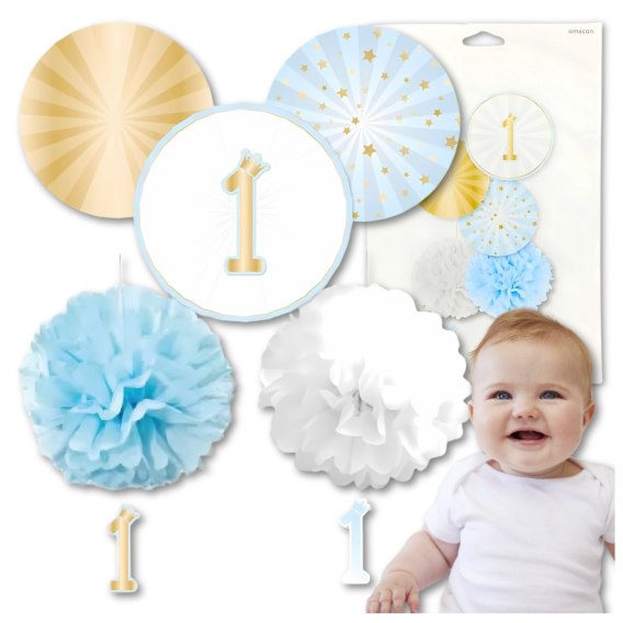 ✅Uczyń swoje pierwsze urodziny wyjątkowo uroczystymi z tym zestawem dekoracji w kolorze niebieskim, białym i złotym. Zestaw składa się z pięciu papierowych elementów, w tym pomponów o średnicy 40 i 30 cm. Idealne do szybkiej i stylowej dekoracji miejsca imprezy.