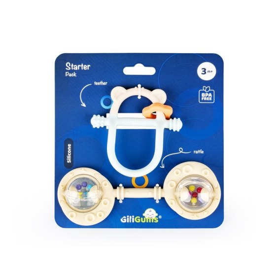 Dwupak łączy w sobie walory praktyczne i estetyczne, bawiąc oraz przynosząc ulgę w ząbkowaniu! W zestawie znajdziemy gryzak Miś oraz Podwójną Grzechotkę w kolorze beżowym. Obie zabawki posiadają wypustki, które podczas gryzienia będą delikatnie masować dziąsła ząbkującego bobasa. Kształt gryzaczka oraz grzechotki dopasowany jest do małych rączek, co umili maluchowi korzystanie z nich. Ten praktyczny zestaw świetnie sprawdzi się w charakterze prezentu.