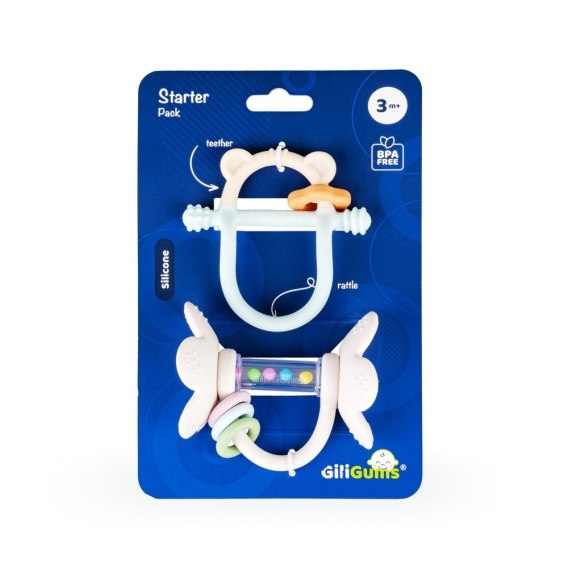 Dwupak na start, który zabawi i przyniesie ulgę podczas ząbkowania! Ten uroczy zestaw składa się z dwóch przydatnych produktów: gryzaczka, którego konstrukcja ułatwia chwytanie zabawki małymi rączkami oraz grzechotki wyposażonej w ruchome pierścienie. Obie zabawki posiadają wypustki, które podczas gryzienia delikatnie masują podrażnione ząbkowanie dziąsełka bobasa. Zestaw wspaniale sprawdzi się w charakterze prezentu dla maluszka.