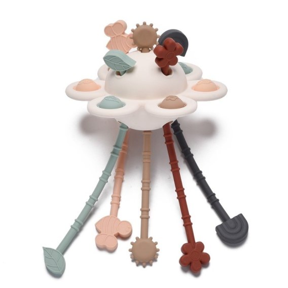 Małe co niego dla miłośników przyrody! Ta stylowa zabawka w pięknych kolorach ziemi zapewni moc sensorycznej zabawy. Znajdziemy tu kilka kuleczek do wciskania i wyciskania z powrotem na górę oraz pięć kolorowych linek do przeciągania. Każdą z nich zdobią wypustki i urocze kształty.