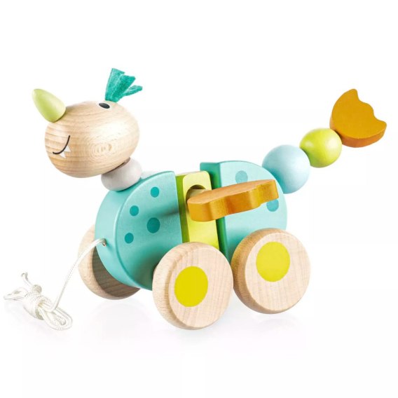Zabawka do ciągnięcia jest doskonałym rozwiązaniem dla dzieci uczących się chodzić, które potrzebują pomocy, aby utrzymać motywację. Prosty mechanizm sprawia, że skrzydła i ogon machają podczas chodzenia dziecka, zapewniając wiele godzin zabawy. Zabawka rozwija podstawowe zmysły, umiejętności motoryczne i koordynację. Dzięki wytrzymałym kółkom zabawka może być używana nie tylko w domu, ale także na zewnątrz. Zabawka jest wykonana z naturalnego drewna bukowego, a użyte kolory są na bazie wody.