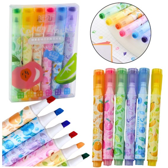 ✔️ 6 kolorowych zakreślaczy z motywem owoców i pieczątką w zatyczce
