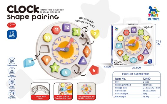 Edukacyjny zegar z sorterem kształtów dla najmłodszych od dwunastego miesiąca życia. Zestaw wykonany został z bezpiecznych materiałów w żywych kolorach. Na tarczy zegara znaleźć możemy ruchome wskazówki oraz numerki od 5 do 60. Po zewnętrznej stronie tarczy znajduje się sorter kształtów. We wgłębieniach o różnych kształtach maluszek może umieścić aż 12 klocków. Każdy klocuszek oznaczony jest numerem od 1 do 12. Dzięki temu zestawowi, przez zabawę, maluszek oswoi się z zegarem, nauczy rozpoznawać minuty i godziny, pozna różne kształty i kolory.