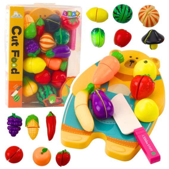 W zestawie znajduje się deska do krojenia w kształcie misia oraz bezpieczny nożyk, który nie posiada ostrych krawędzi. To idealna propozycja zabawy dla dzieci, która rozwija wyobraźnię, zdolności manualne, koordynację ruchową oraz uczy podstaw zdrowego odżywiania.