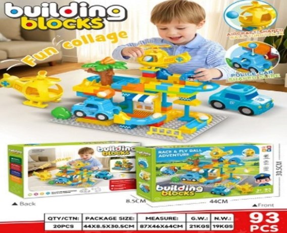 Zestaw, dużych, kolorowych klocków umożliwiający zbudowanie stacji policji dla dzieci od trzeciego roku życia. Klocuszki bardzo łatwo się ze sobą łączą i tworzą stabilne konstrukcje. Bogactwo kolorów zachęca dziecko do kreatywnej zabawy. W zestawie mamy również zjeżdżalnię, samochodzik, helikopter i trzy piłeczki. Helikopter i autko policyjne posiada otwór umożliwiający przelatywanie przez nie piłeczki. Zestaw idealny do kreatywnej zabawy.