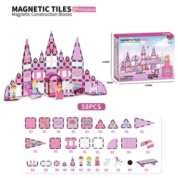 Zestaw klocków magnetycznych do zbudowania zamku księżniczki, dla dzieci od trzeciego roku życia. Zestaw składa się z 58 elementów, klocków magnetycznych oraz magnetycznych postaci królewicza, królowych czy jednorożca i zajączka. Klocki magnetyczne wykonano z trwałego tworzywa sztucznego. Łączą się ze sobą za pomocą magnesów neodymowych. Możemy je łączyć w różnych konfiguracjach i pod różnymi kątami, tworząc konstrukcje 3D. Układanie klocków pozytywnie wpływa na rozwój kreatywności, uczy cierpliwości i skupienia.