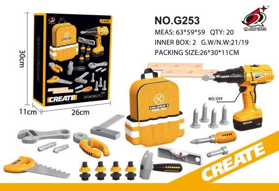 - plecak na narzędzia ok. 30 cm x 26 cm x 9 cm, - wiertarko-wkrętarka ok. 19 cm x 19 cm x 5 cm, - wymienne bity do wkrętarki ok. 6 cm długości - piła ręczna ok. 20 cm x 10 cm x 2 cm, - młotek ok. 14,5 cm x 4 cm x 3 cm, - klucz nastawny ok. 14 cm x 5,5 cm x 2 cm, - kombinerki ok. 14 cm x 6 cm x 1,5 cm, - kątownik ok. 13,5 cm x 8 cm x 1,3 cm, - nasadka do śrubokręta ok. 9,5 cm x 3,5 cm, - wymienne bity do śrubokręta ok. 6,5 cm długości, - 2 drewienka do wkręcania śrubek ok. cm długości i cm długości, - poziomica ok. 15,3 cm x 3 cm x 1,5 cm, - kołki rozporowe ok. 6 cm x 3 cm, - śrubki ok. 5,5 cm x 3,5 cm, - nakładki ok. 3,5 cm średnicy, - 2 x element do wkręcania ok. 20 cm x 4 cm x 1,4 cm, - opakowanie ok. 26 cm x 11 cm x 30 cm. |