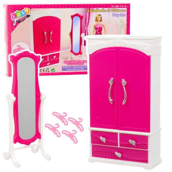 W komplecie znajduje się również stojące lustro w pięknej, ozdobnej ramie. Jego stabilna podstawa oraz duża powierzchnia odbijająca sprawiają, że lalki mogą „przymierzać" stroje, a dzieci mogą odgrywać liczne scenariusze związane z modą i codziennymi czynnościami. Całość wykonano z trwałego tworzywa sztucznego, które jest bezpieczne, estetyczne i odporne na codzienną zabawę. Klasyczne połączenie kolorów różu i bieli nadaje zestawowi atrakcyjny wygląd, który spodoba się każdej małej miłośniczce zabawy lalkami.