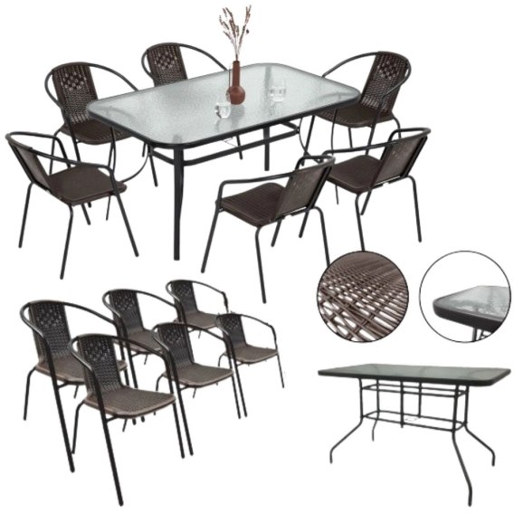 Blat stołu wykonany jest z hartowanego szkła o wzorze falującej wody - elegancki i łatwy w utrzymaniu. Konstrukcja stalowa, malowana proszkowo, gwarantuje stabilność i odporność na warunki atmosferyczne. Krzesła wykonane są z tworzywa sztucznego imitującego technorattan oraz stalowego stelaża, dzięki czemu są lekkie, trwałe i gotowe do użytku od razu po rozpakowaniu - bez skręcania. Co więcej, można je sztaplować, co ułatwia ich przechowywanie i transport.