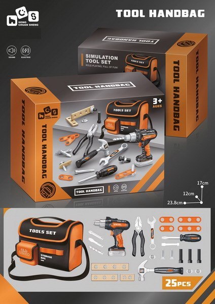 - torba na narzędzia ok. 23,5 cm x 16 cm x 10,5 cm, - wiertarko-wkrętarka ok. 15 cm x 15 cm x 5 cm, - wymienne bity: płaski, krzyżakowy, wiertło ok. 6,5 cm długości, - wymienne końcówki do śrubokręta ok. 8 cm długości, - nasadka do śrubokręta ok. 8 cm x 2,5 cm, - młotek ok. 17 cm x 8 cm x 2 cm, - klucz płasko-oczkowy ok.14 cm x 4 cm x 1,5 cm, - kombinerki ok. 15 cm x 5 cm x 1,5 cm, - mniejsze elementy do wkręcania ok. 6 cm x 2,5 cm, - większe elementy do wkręcania ok. 9 cm x 2,5 cm, - drewienko różnej wielkości do wkręcania ok. 6,5 cm długości, ok. 12 cm i ok. 16 cm, - śruba ok. 5,5 cm długości, - nasadki ok.3 cm średnicy, - kołki rozporowe ok. 5 cm x 3 cm, - opakowanie ok. 23,5 cm x 17,5 cm x 12,5 cm. |