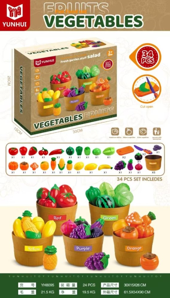 - atrapy owoców i warzyw w kolorze czerwonym np. pomidor, truskawka, czereśnia, papryczka, jabłko, - atrapy owoców i warzyw w kolorze zielonym np. arbuz, sałata, papryka zielona, 2 x sałata, - atrapy owoców w kolorze żółtym np. banan, cytryna, kukurydza, ananas, - atrapy owoców i warzyw w kolorze fioletowym np. bakłażan, 2 x jagoda, - atrapy owoców i warzyw w kolorze pomarańczowym np. dynia, marchewka, - 2 x deska do krojenia, - 2 x nóż, - 5 x kosz do segregacji warzyw i owoców. |