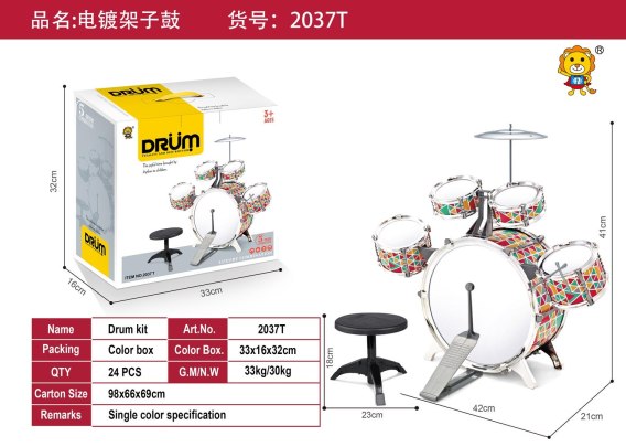 - perkusja ok. 56 cm x 50 cm x 36 cm, - bęben duży o średnicy zewnętrznej ok. 30 cm, - bęben średni o średnicy zewnętrznej ok. 12,5 cm - bęben mały o średnicy zewnętrznej ok. 11 cm, - talerz metalowy o średnicy ok. 14,5 cm. - pałeczki o długości ok. 14 cm, - stołeczek ok. 24 cm x 21,5 cm, - opakowanie ok. 33 cm x 32 cm x 16,5 cm. |
