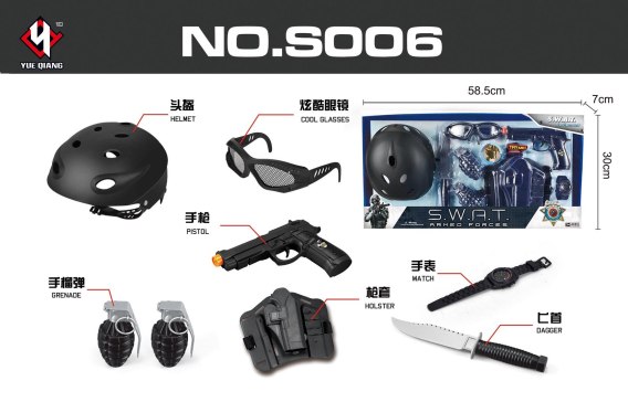 - kask ok.17,5 cm x 22 cm x 12 cm, - okulary ok. 18 cm x 5 cm, - pistolet ok. 20 cm x 12,5 cm x 3,5 cm, - granat ok. 10 cm x 6 cm, - nóż ok. 24 cm x 7 cm, - kabura do pistoletu ok. 20 cm x 16 cm, - kamizelka kuloodporna ok. 27 cm x 33 cm, - opakowanie ok. 59 cm x 30 cm x 15 cm. |