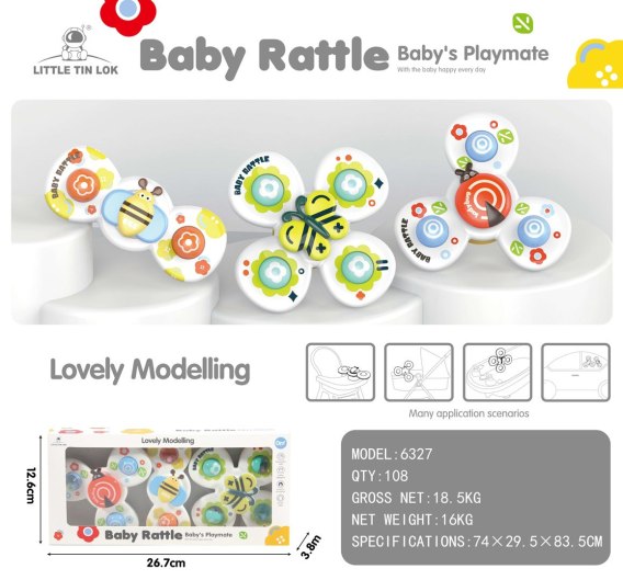 Funkcje zabawki: - odpowiednia dla dzieci od pierwszych dni życia, - wykonana z najlepszej jakości materiałów, - spinerki posiadają przyssawki, - spinerki wydaję delikatne odgłosy podczas obracania, - elastyczne łożysko zapewnia długie obroty. |