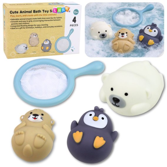 W zestawie znajdują się trzy miękkie gumowe zwierzątka: wydra, pingwinek oraz miś polarny. Figurki są lekkie, elastyczne i łatwe do chwytania przez małe rączki, a także unoszą się na powierzchni wody. Czwartym elementem jest praktyczna siatka do łowienia zwierzątek, wykonana z trwałego tworzywa sztucznego. Dzięki niej dziecko może wyławiać pływające zwierzątka z wody, ćwicząc koordynację ręka oko, precyzję ruchów oraz cierpliwość.