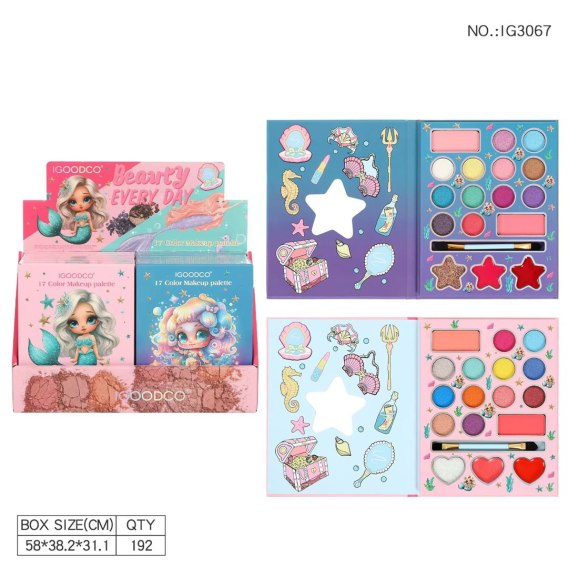 - paleta z wizerunkiem syrenki i lusterkiem, - pędzelek, - 17 kosmetyków: 14 cieni do powiek, 3 błyszczyki. |